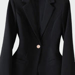 Večno sako z elegantnim krojem, ki poudarja ženskost in stil. Enogumbno zapiranje na sprednji strani dodaja nežnost, medtem ko žepi v čistih linijah krepijo minimalistični značaj. Idealno za službene nastope, pa tudi za elegantne večerne izlete.