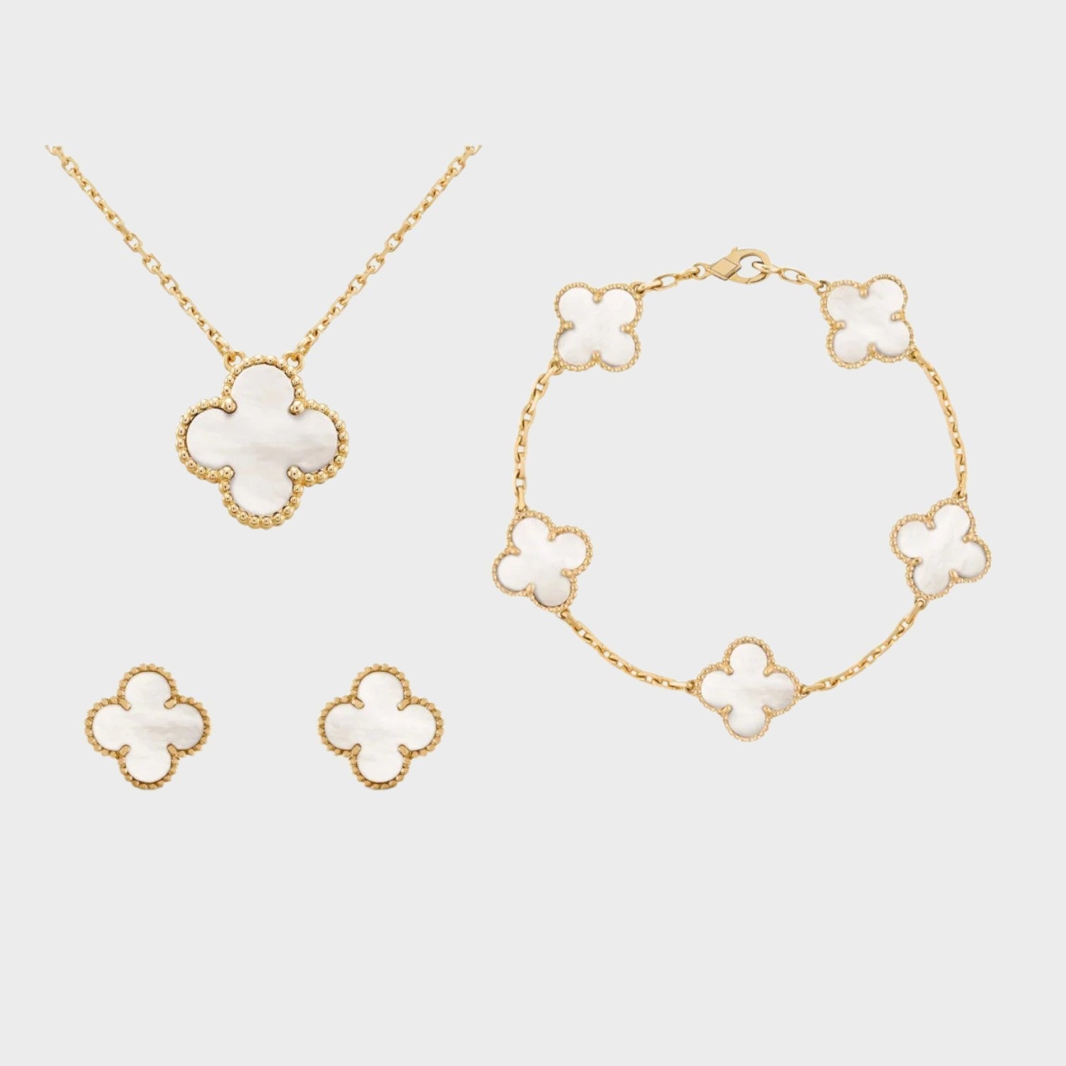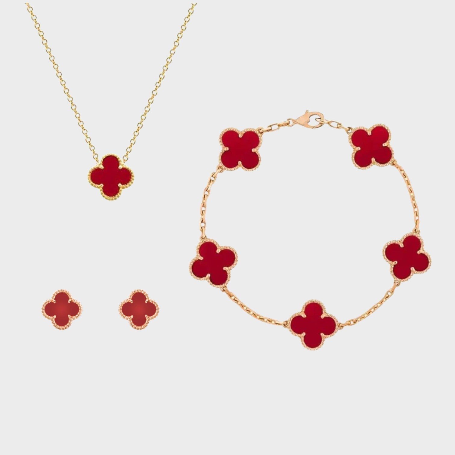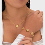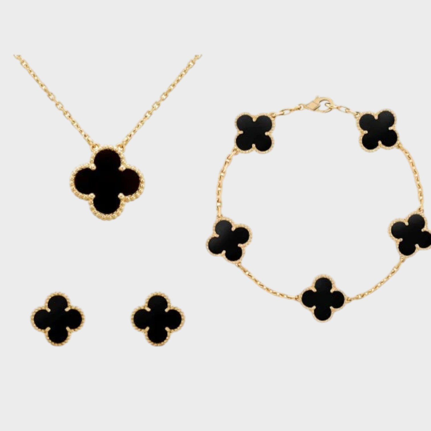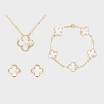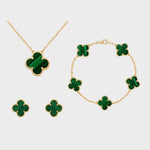 Naš komplet nakita s štirlistno deteljico, ki vključuje ogrlico, zapestnico in uhane, je idealna kombinacija rafiniranosti in čara. Nežno oblikovane deteljice simbolizirajo srečo in lepoto ter dodajajo vašemu videzu pomenljiv pridih.