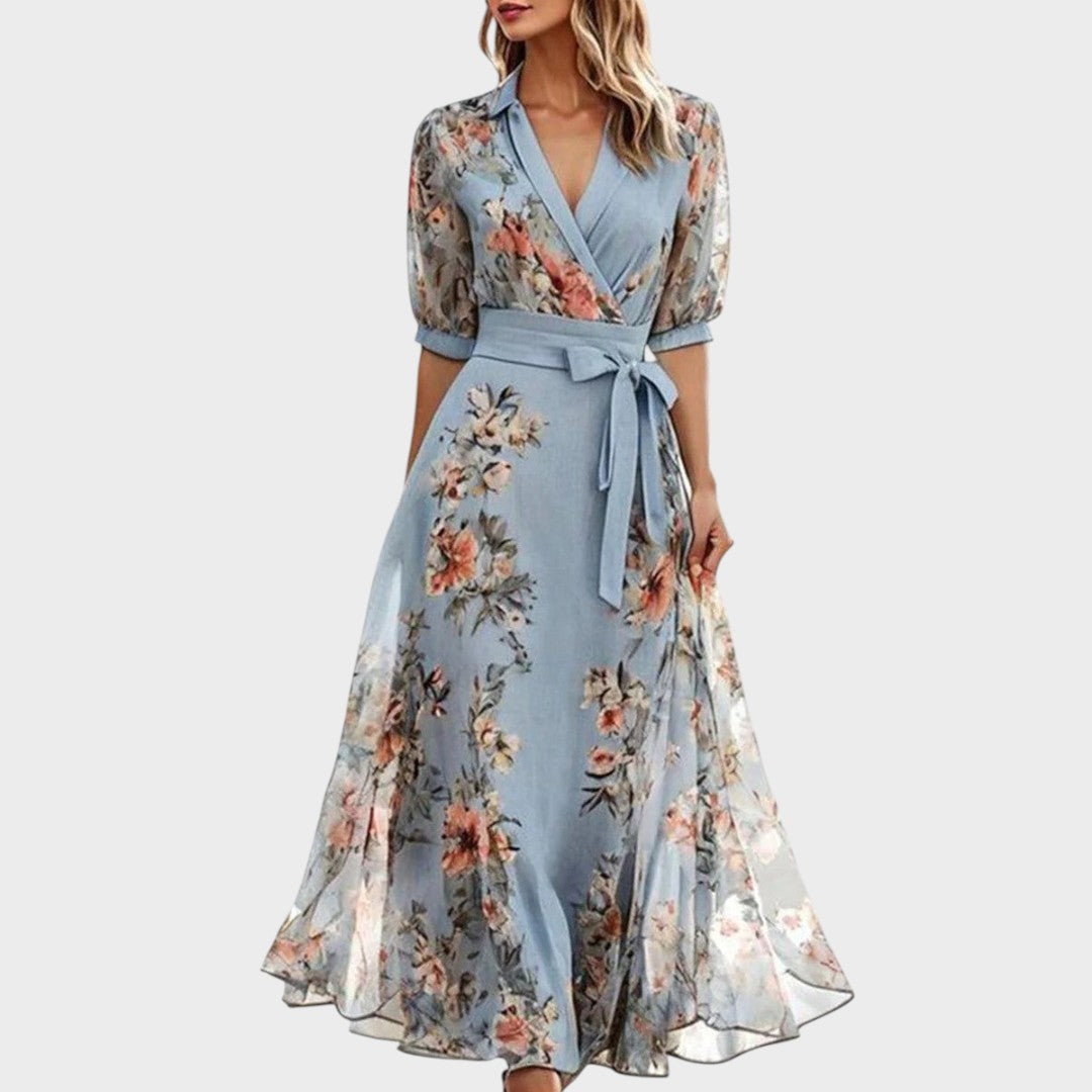 Nika - Cvetna midi obleka z V-izrezom