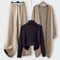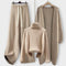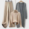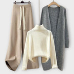 Ta elegantni pleteninski set vključuje široke hlače z nastavljivim pasom, visok pulover in dolg plašč, kar ga naredi popolnega za hladnejše dni. Mehka tekstura in brezhibno prileganje zagotavljata sofisticiran videz, idealen za nošenje doma, na delu ali na izletih.