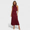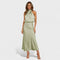 Haljina Alda je zasnovana za elegantne in samozavestne ženske. Njen visok draperija izpostavlja obraz in dekolte z dostojanstvom, medtem ko fluidno krilo ovija boke s subtilnim gibanjem. Popolna izbira za poroke, dogodke ali večerje, ko želite izstopati s klasiko.